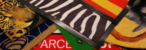 Felpudo para uso publicitario. Fibra 100% poliamida “velour” sobre base de PVC . Peso de fibra 400 gr/m2. Borde de PVC perimetral en color negro de 2,5 cm. Impresión mediante termotransferencia. Disponible en tres formatos de medidas estándar